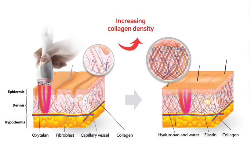 RF heats deep skin to stimulate fibroblast, include collagen regreneration, increase blood circulation and eliminate body waste.