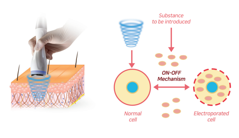 Electric current makes temporarily micro tiny holes of the skin cell to transdermal delivery of liquid solution into the skin effectively.